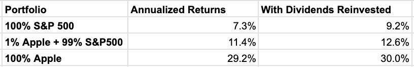 Your $100 in Apple would have turned into $139k while your $9,900 in the S&P 500 turning into about $73k, for a total of $212k. With this extra 1% risk you took, you nearly tripled your investments!