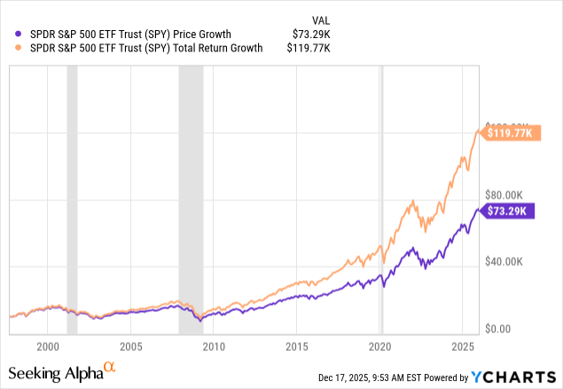 If you had invested $10,000 in the S&P 500 in September 1997, you would have about 73k today (or about $120k with dividends reinvested.)