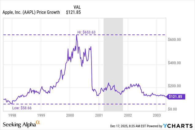 By the end of 1997, your $100 was down over 40% and at the peak of the dotcom bubble reached a value of $653 before crashing back to around $130. And by mid 2003 (nearly six years from your initial investment), your $100 had turned into a mere $121.