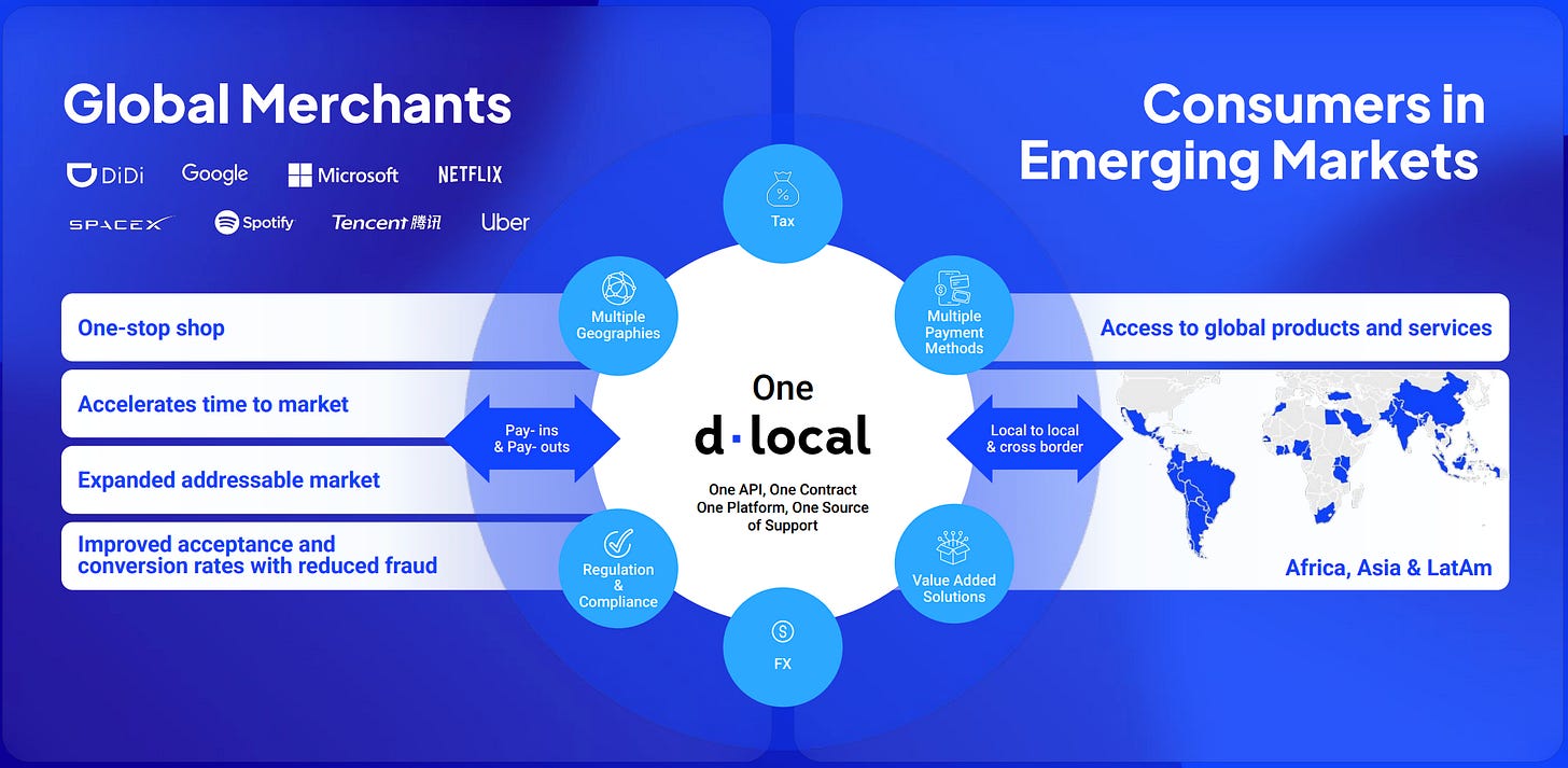 dLocal is an Uruguayan fintech company with a very simple business. It connects global merchants with local payment systems in over 40 countries worldwide.