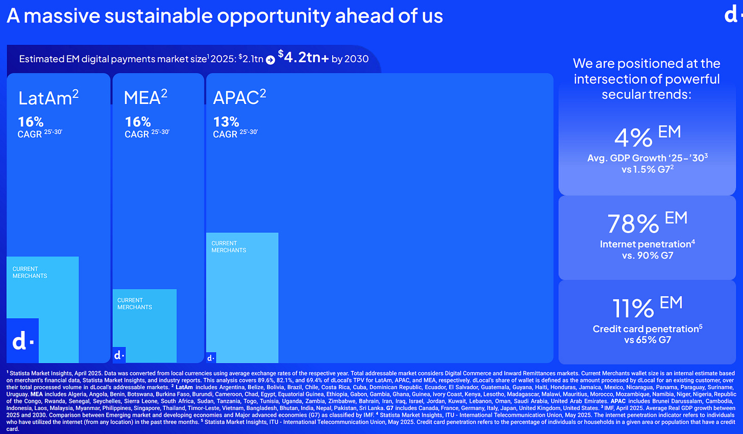 The population of emerging markets is growing rapidly and people are getting richer with better access to technology. They are spending more money online and dLocal is likely to take a share of these transactions.