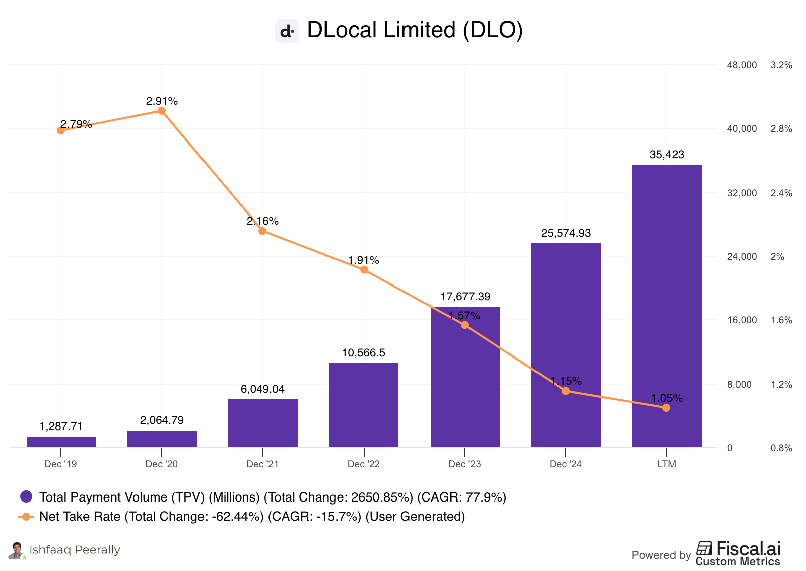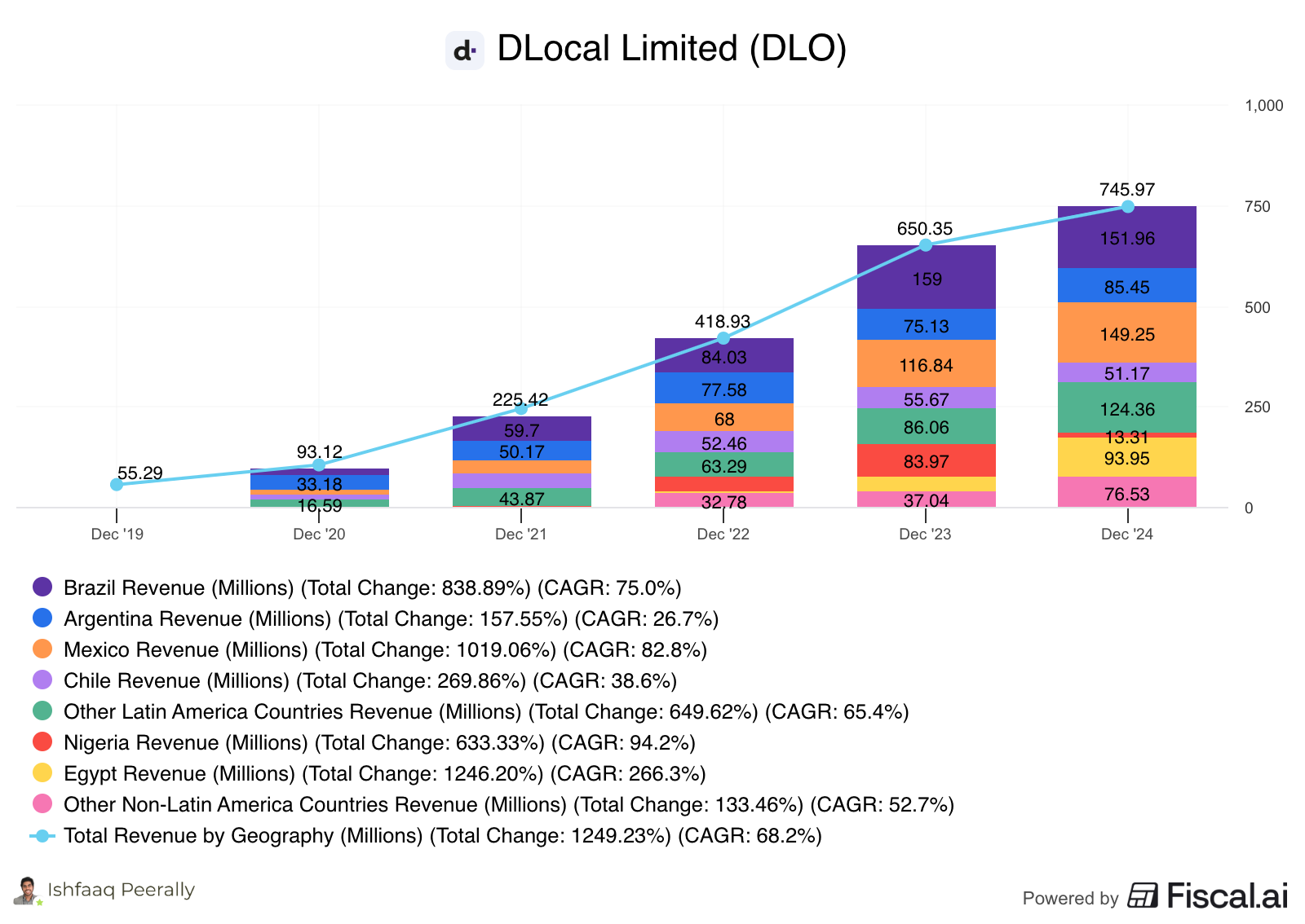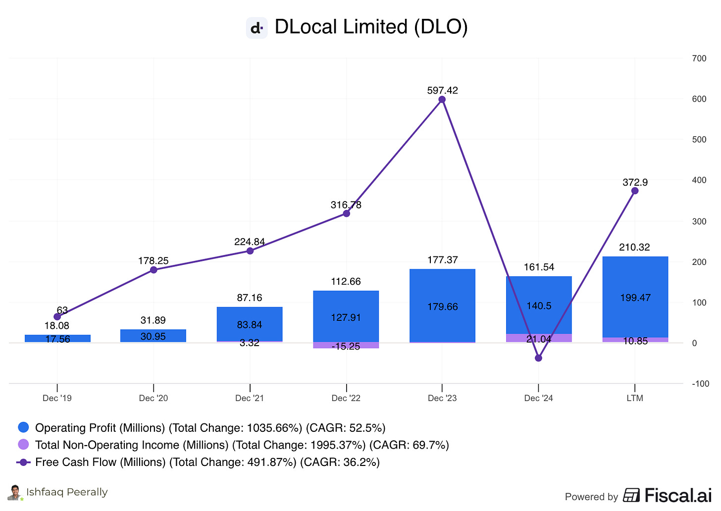 dLocal has grown revenue by 68% per year on average for the last 5 years, is profitable, is capital-light, with insiders owning about half of the company. It fits almost every checklist of what makes a great company.