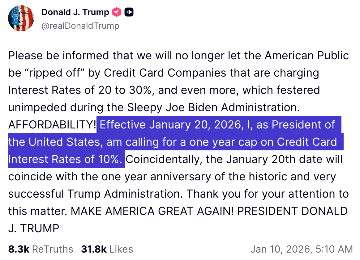 President Trump recently posted on Truth Social1 that he was going to cap interest rates on credit cards at 10%. There has since been much debate with misconceptions on all sides, about: