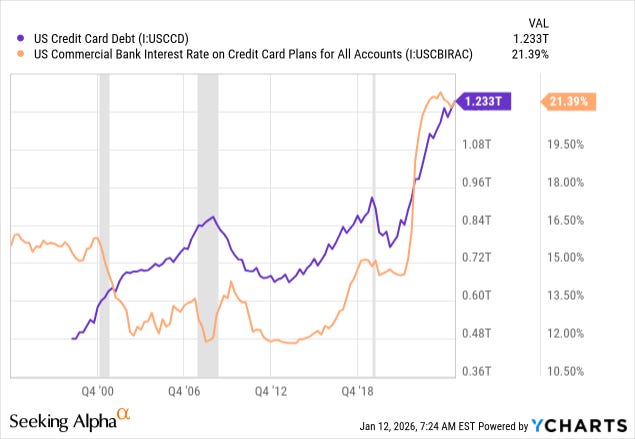 In the last few decades, U.S. credit card debt has ballooned to roughly $1.2 trillion, while average interest rates have climbed above 20%. A simple, back-of-the-envelope calculation puts gross interest income from credit cards at around $240 billion a year.