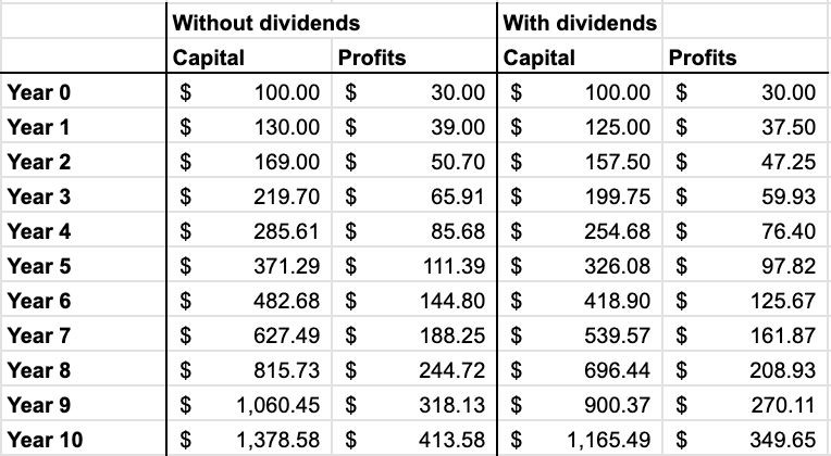 Let’s say a business generates $30 in profits from every $100 of capital. If it reinvests everything into the business, it will have $130 of starting capital and will generate $39 in profits the following year. It can keep reinvesting at high rates. If instead, it pays $5 in dividends, it will have starting capital of only $125 with profits of $37.50 after one year.