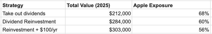 There’s a simple way this problem could have been alleviated. Instead of taking the dividend payments out of the portfolio, they could have been reinvested. Then, the total investment in Apple would have been $164k for a total of $284k, with a total exposure of a little less than 60%.